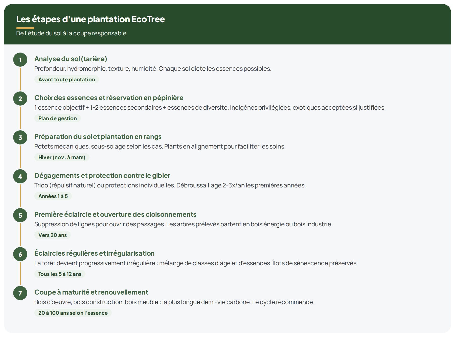 L'analyse des sols, préalable systématique à toute plantation, conditionne tout le reste. Avant de décider quels arbres ils planteront, les forestiers d'EcoTree font des sondages à la tarière pour analyser la profondeur, le taux d'humidité, l'hydromorphie, la texture limoneuse, sableuse ou argileuse, la présence de cailloux. C'est ce diagnostic qui permettra de savoir si ce terrain convient à du chêne, à du Douglas, à du pin maritime, ou s'il vaut mieux laisser se développer une zone humide.