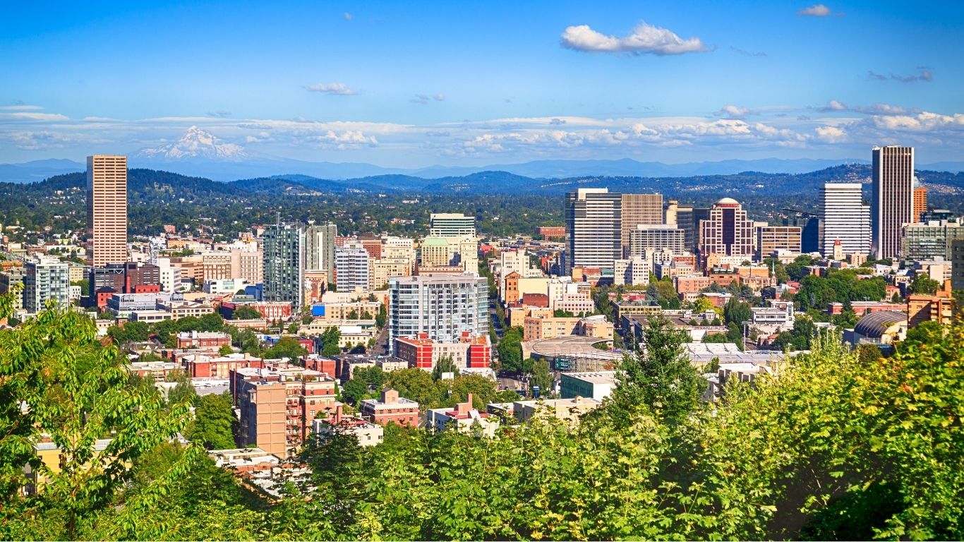 Située au confluent des fleuves Willamette et Columbia, elle bénéficie d'un climat océanique et reçoit jusqu'à 380 m³ de précipitations par an. Surnommée « la ville des roses » en raison de ses nombreux jardins, dont le célèbre International Rose Test Garden, elle allie nature et urbanisme durable. Afin de poursuivre cette démarche, la ville s'est fixé des objectifs concrets : réduire ses émissions de gaz à effet de serre de 60 % d'ici à 2030 et atteindre la neutralité carbone d'ici à 2050.