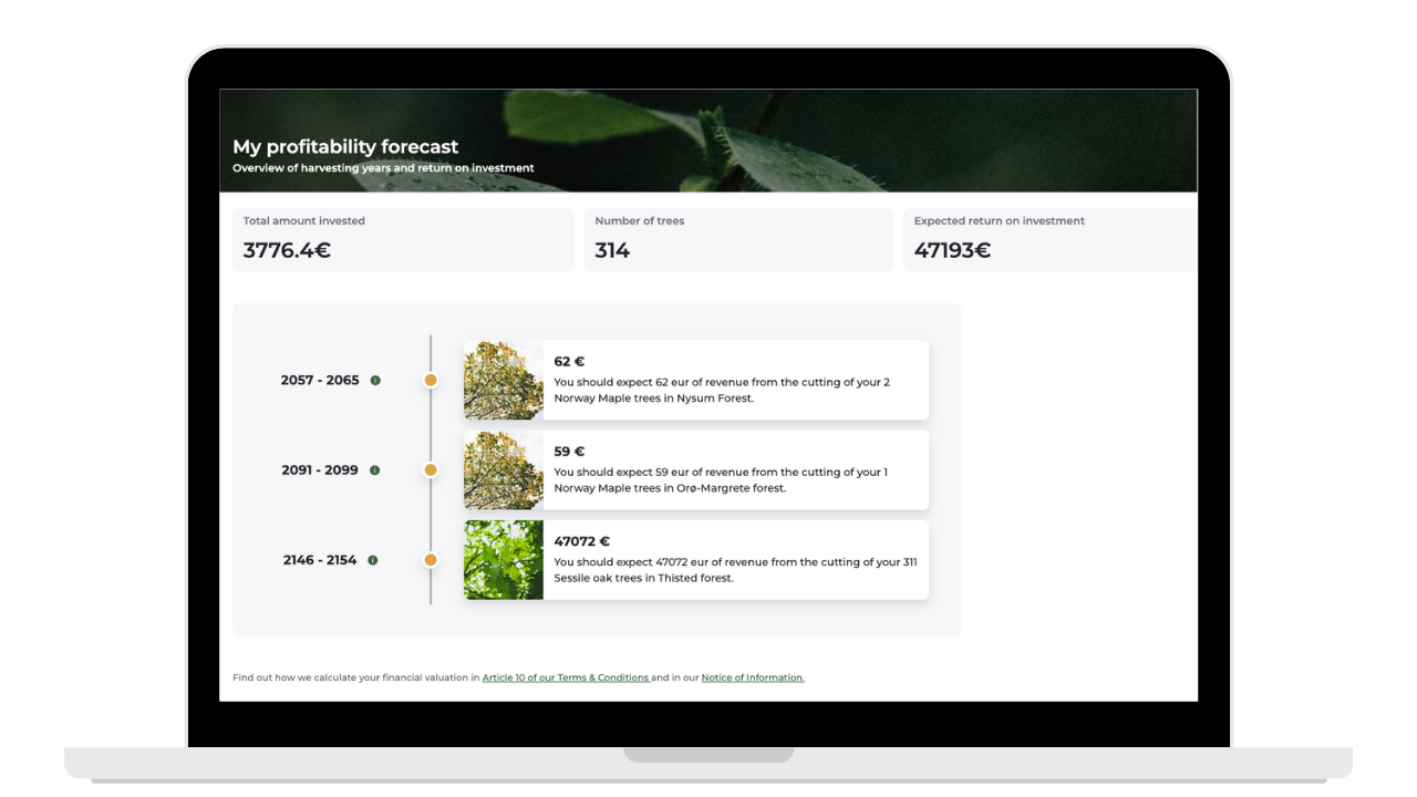 When the trees are harvested, you have the option to either receive your profits via bank transfer or reinvest them in new trees to continue growing your EcoTree forest portfolio.