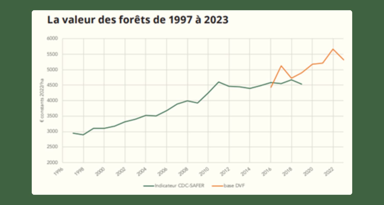Les prix des forêts exploitables ont progressé en moyenne de 3,3 % par an, et la valeur vénale des forêts en France a connu une croissance annuelle de 2 à 6 % ces dernières années. Sur dix ans, c'est une augmentation de 140 % des prix qui a été observée sur le marché forestier français. Des chiffres qui font pâlir bien des livrets réglementés.